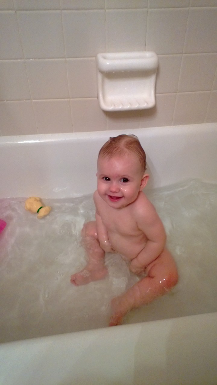 I apologize for the quality of this video. But this is our life these days. I let Juliet play in the bathtub until she's prune-y, and then I let her pull the plug. After she pulls the plug, she tries to grab all the water as is goes down the drain. Once the tub is empty, she runs laps and hollers.